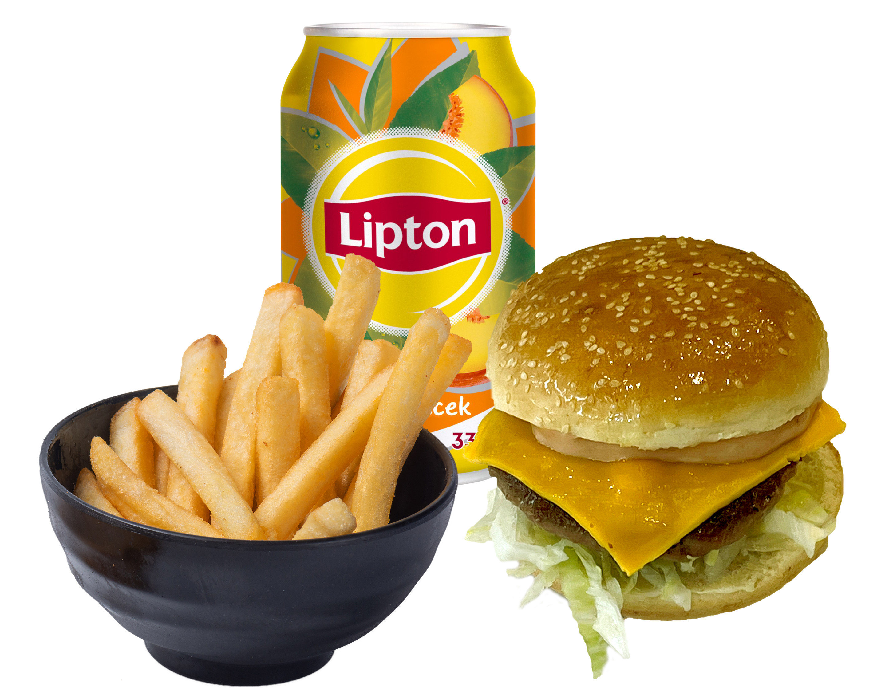 Hamburger ekmeÄŸi, burger köftesi, iceberg salata, cheddar peynir sosu, Patates Kızartması ve Soft İçecek ile...