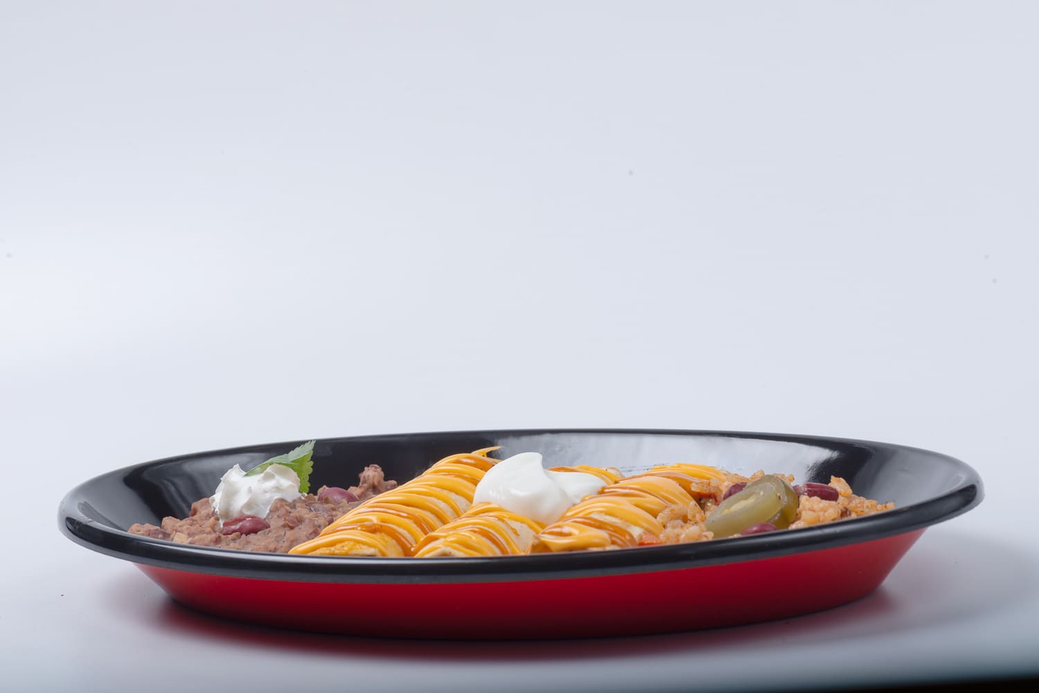 3 adet 15 cm soft taco içine seçeceÄŸiniz Barbacoa stilinde et veya Asado stilinde tavuk veya nohut, kıyma, karides eÅŸliÄŸinde chipotle sosu, piÅŸmiÅŸ soÄŸan ve renkli biber içine sarılmış rol ÅŸeklindeki takolar üzerine cheddar peynir sosu, chipotle sos ve sour cream yanında Meksika pilavı, Meksika fasulye püresi, kiÅŸniÅŸ ve krema ile...