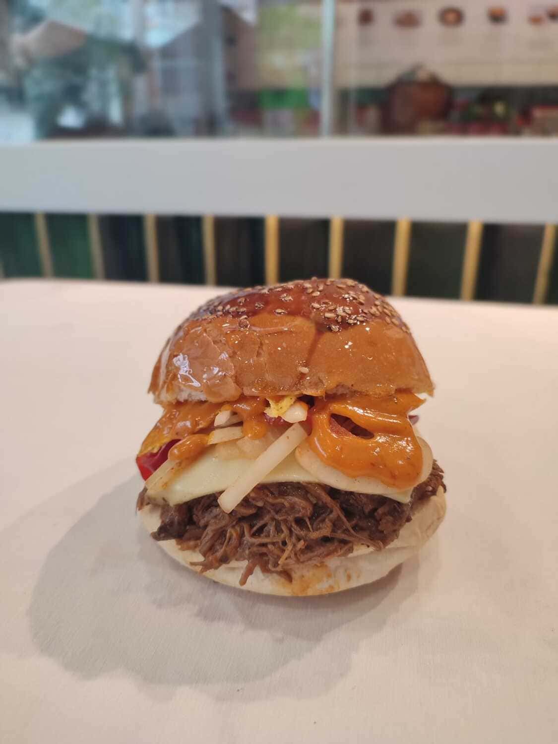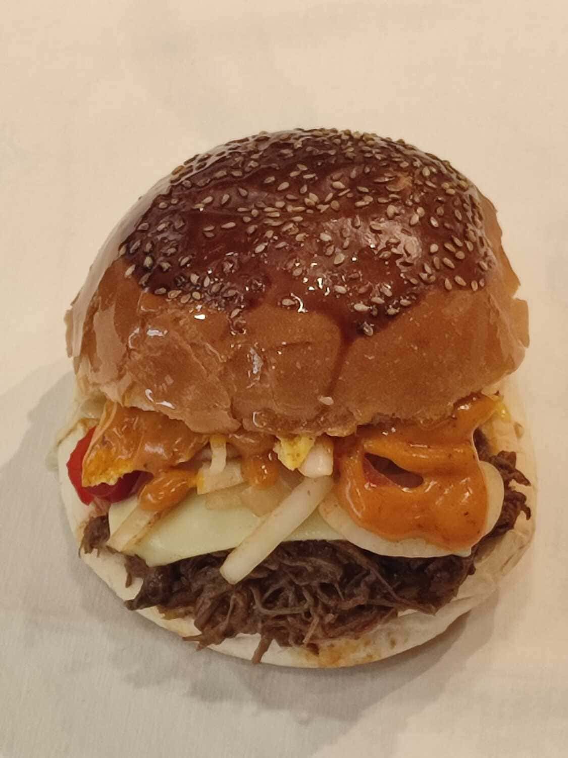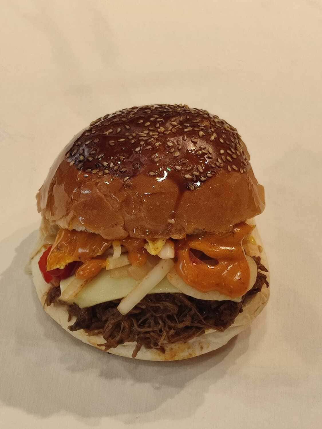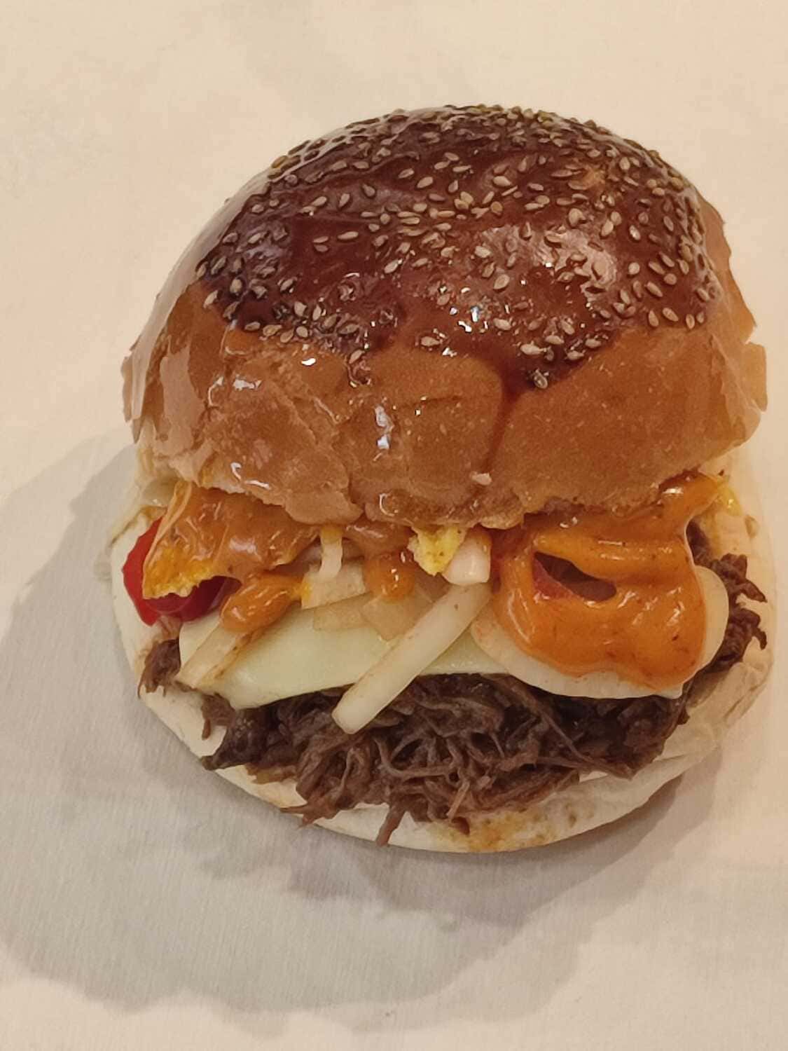 120 gram Barbacoa stilinde piÅŸirilmiÅŸ et, cheddar peynir sosu, piÅŸmiÅŸ soÄŸan ve renkli biber, barbekü sos. chipotle sos ve jalapeno biber ile...