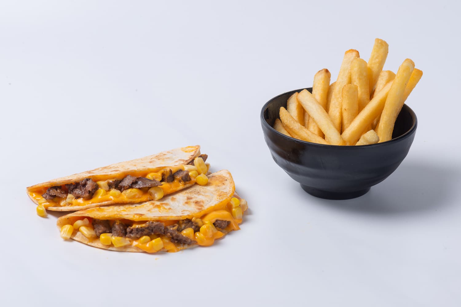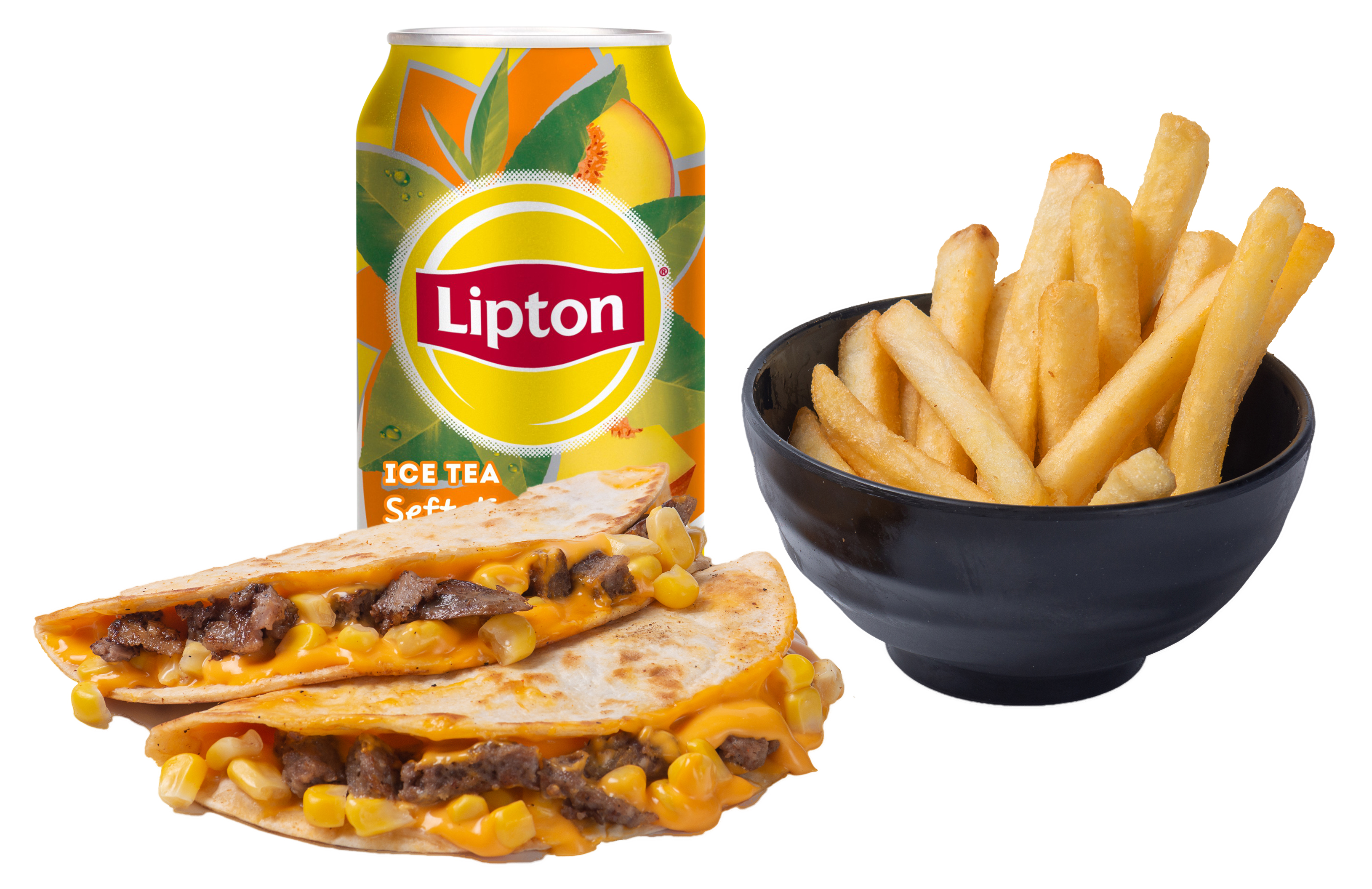 2 adet soft tortilla ekmeÄŸi arasında kıyma, cheddar peynir sosu ve mısır, Patates kızartması ve Soft içecek ile...